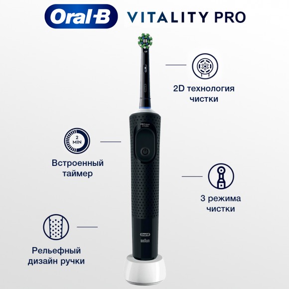Электрическая зубная щетка ORAL-B Vitality Pro D103.413.3 Cross Action Protect X Clean Black бережно удаляет до 100% больше налёта по сравнению с обычной зубной щёткой. Три режима чистки позволяют чистить зубы наиболее подходящим для вас образом. Круглая головка Oral-b Vitality PRO охватывает каждый зуб и обеспечивает превосходное очищение зубов, бережно удаляя до 100% больше налёта. Встроенный таймер помогает чистить зубы в течение двух минут в соответствии с рекомендациями стоматологов и сигнализирует каждые 30 секунд о необходимости сменить зону чистки. Аккумуляторная зубная щетка с удобной батареей, обеспечивающей длительную работу устройства.